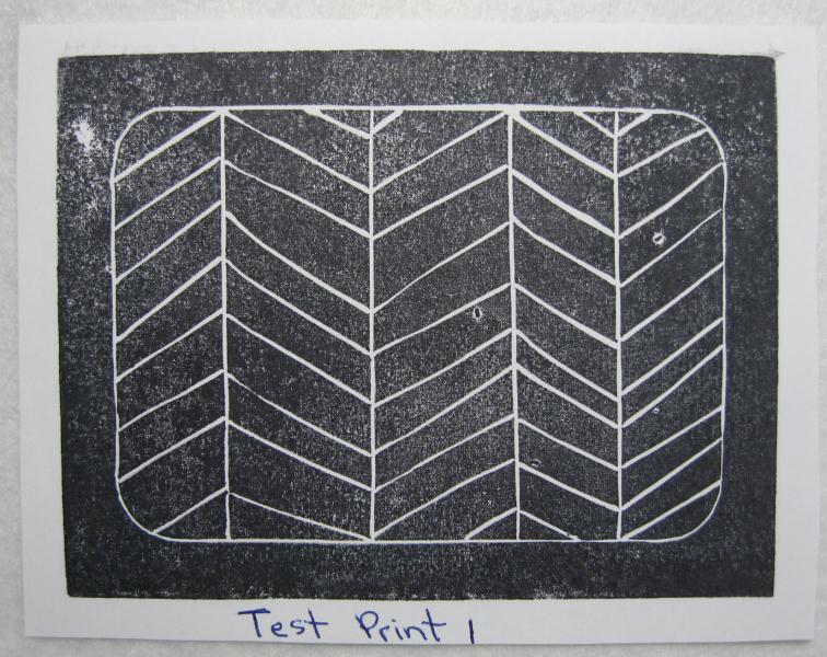 It began with creating a design on paper before doing it on the speedy carve block. Once I was happy with it I began to carve, making many test prints along the way. Here is my first test print: