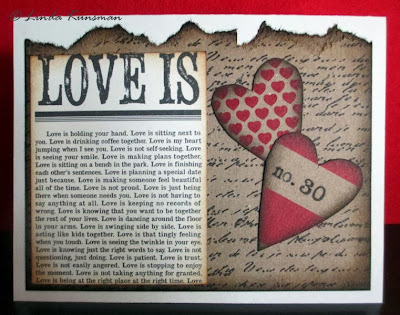 Products: 5 x 7" white card, printed papers from Valentines Scrap Pack (Canvas Corp), Vintage Photo and Black Soot Distress inks (Ranger), alphabet/number sets (PSX).